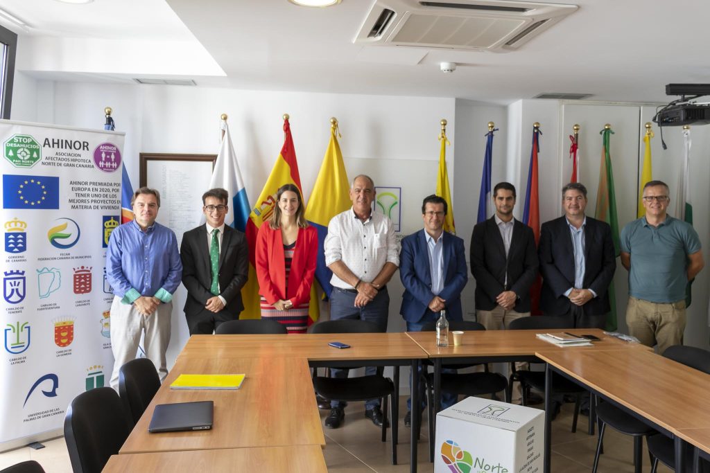 Presidente, Vicepresidente y Gerente de la Mancomunidad de Ayuntamientos del Norte de la Isla de Gran Canaria, reunidos con los abogados de la Asociación de Afectados por la Hipoteca AHINOR